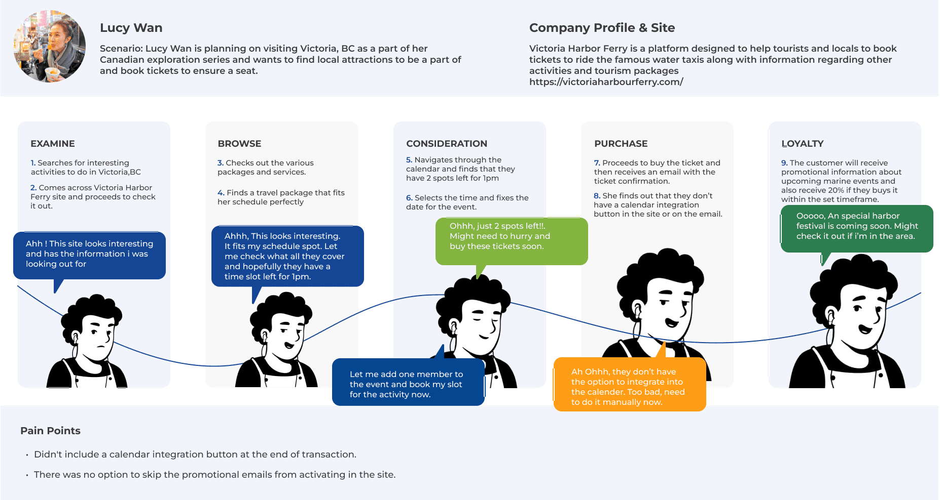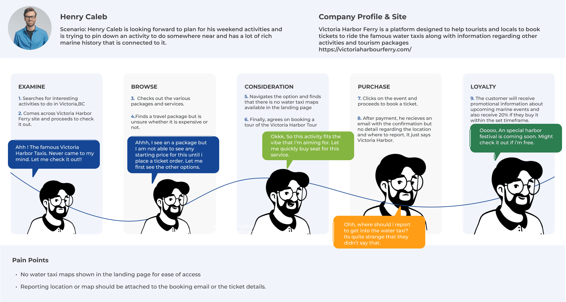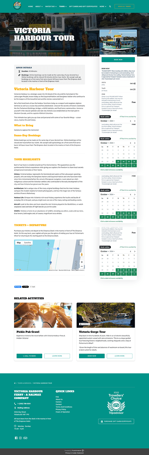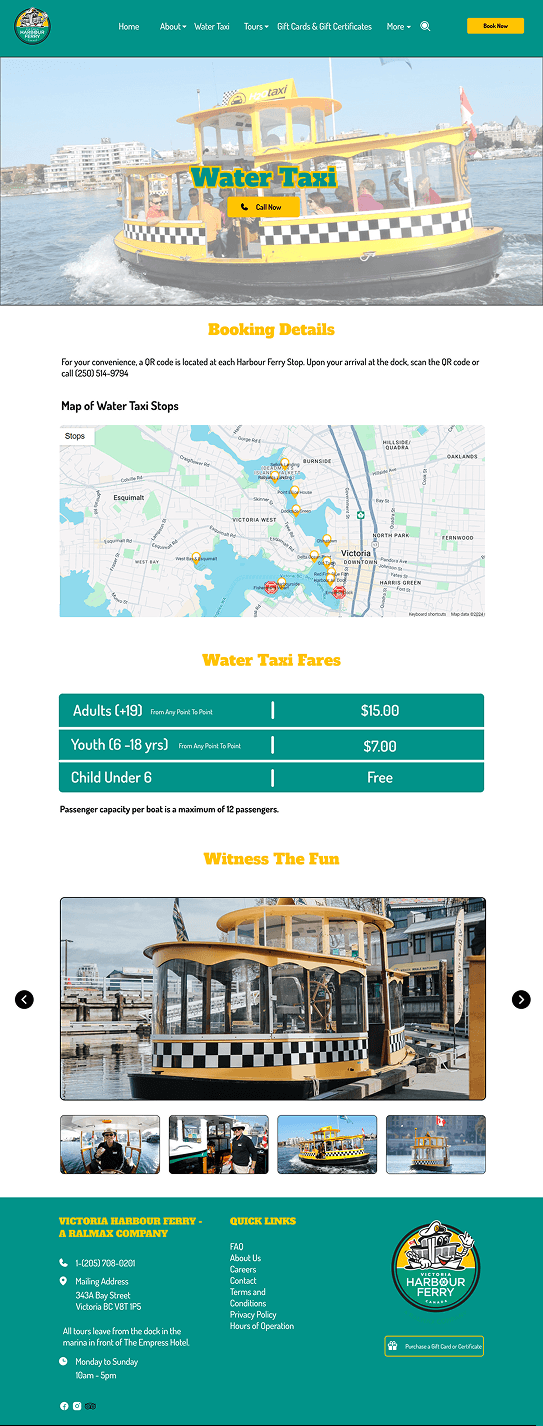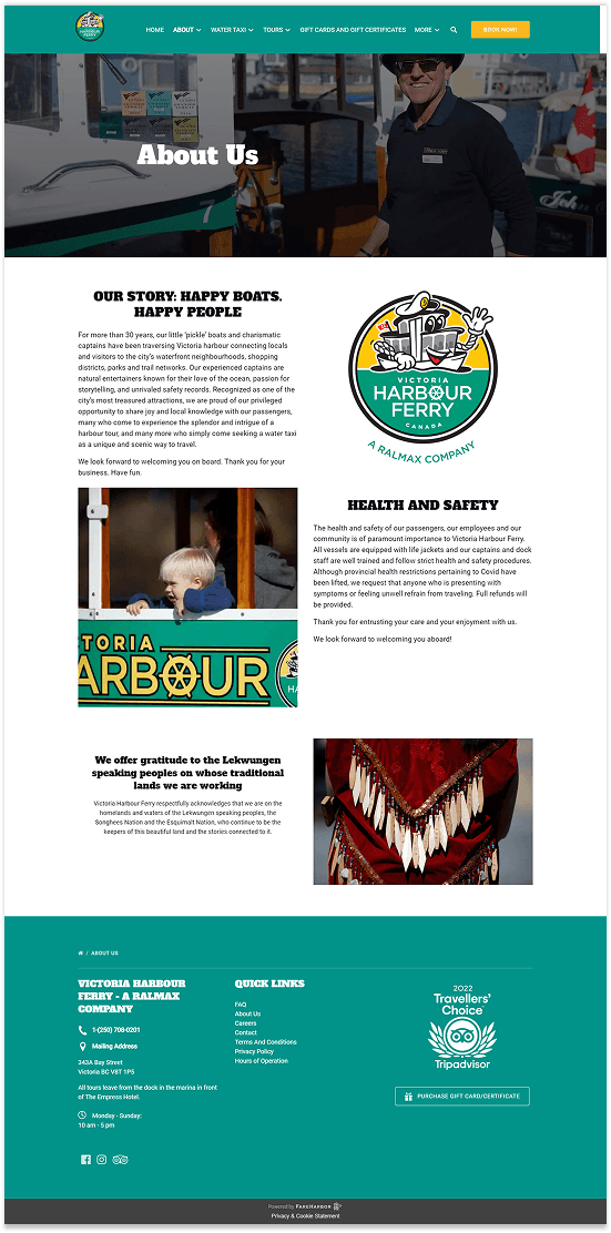 The Victoria Harbour Ferry, known to be one of the best attraction of Victoria,BC has a quite social presence in the internet but lacks the punch and clarity to make sure the customer goes through the rich culture and services that they provide. After researching the website, the main pain points were revealed to be :